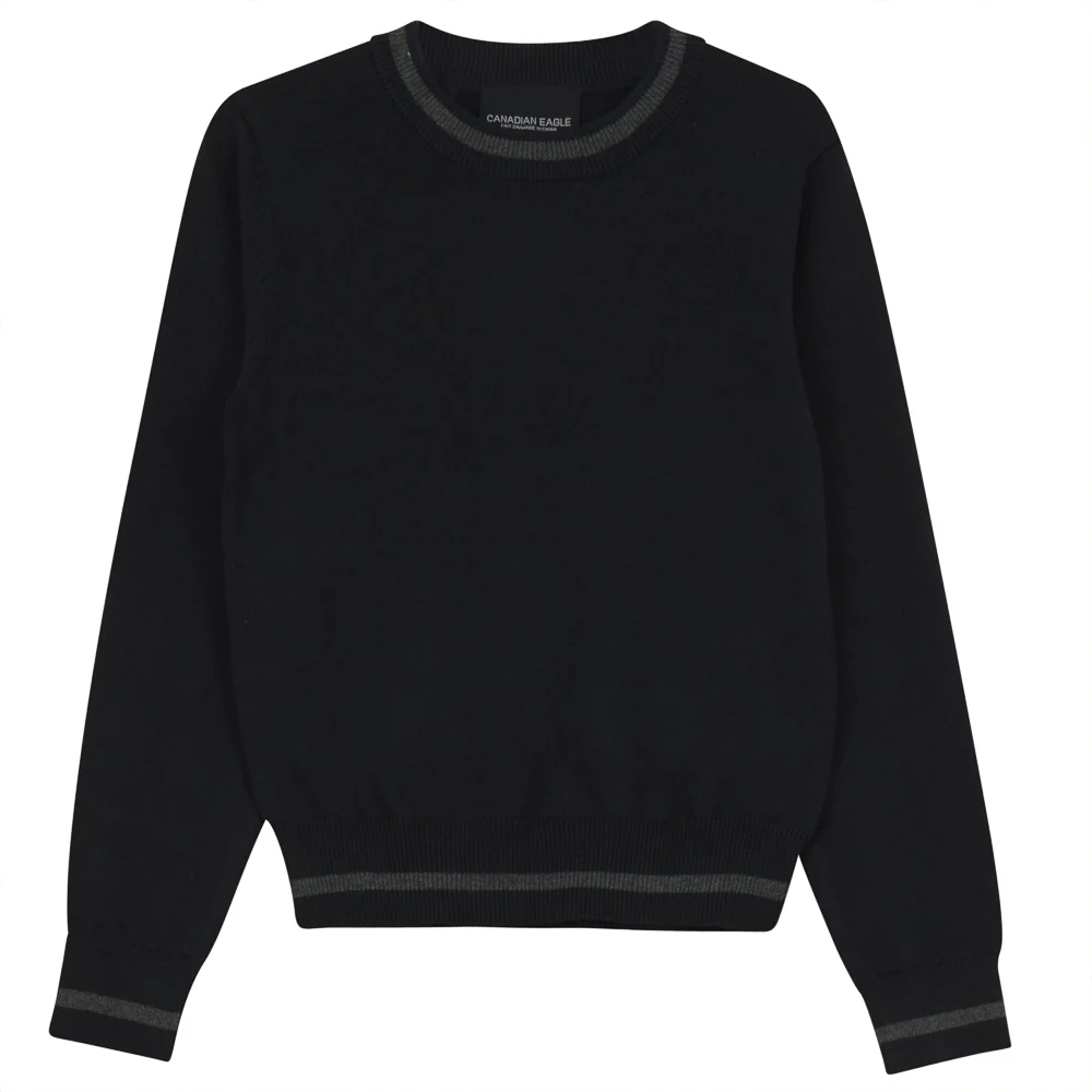 Long sleeve uniform basic crewneck knit sweater with ribbed grey stripe detail around the collar, cuffs and hem.ֲ