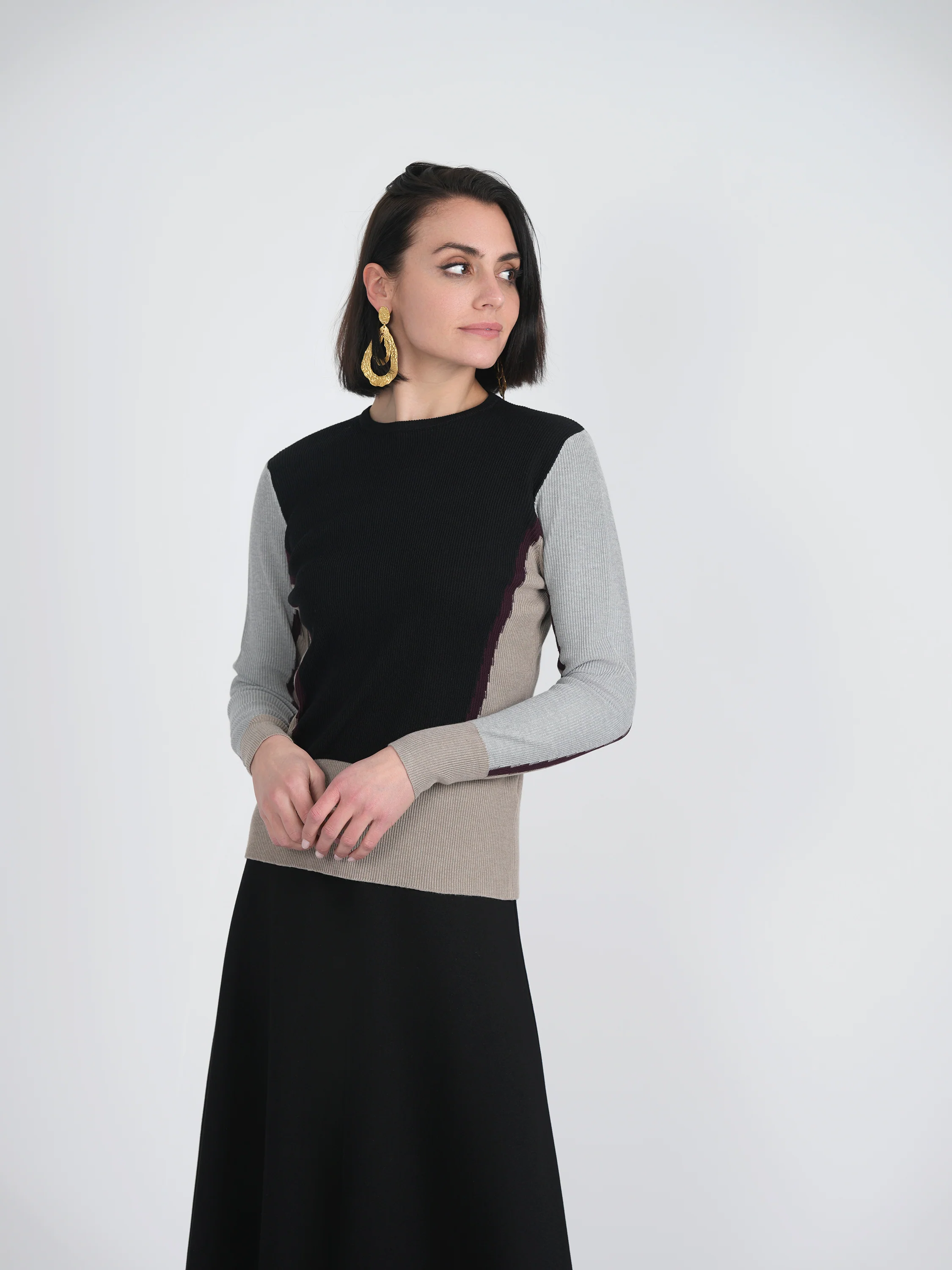 Ladies color blocked sweater with knit around neckline,cuffs and hem. ֲ