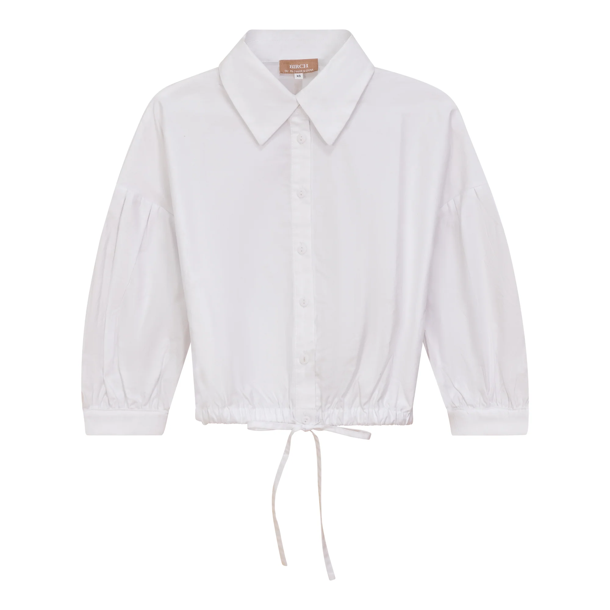 Ladies woven 3/4 striped cropped bungee blouse with center front button opening, wide elastic waistband and self spaghetti tie at bottom. ֲ