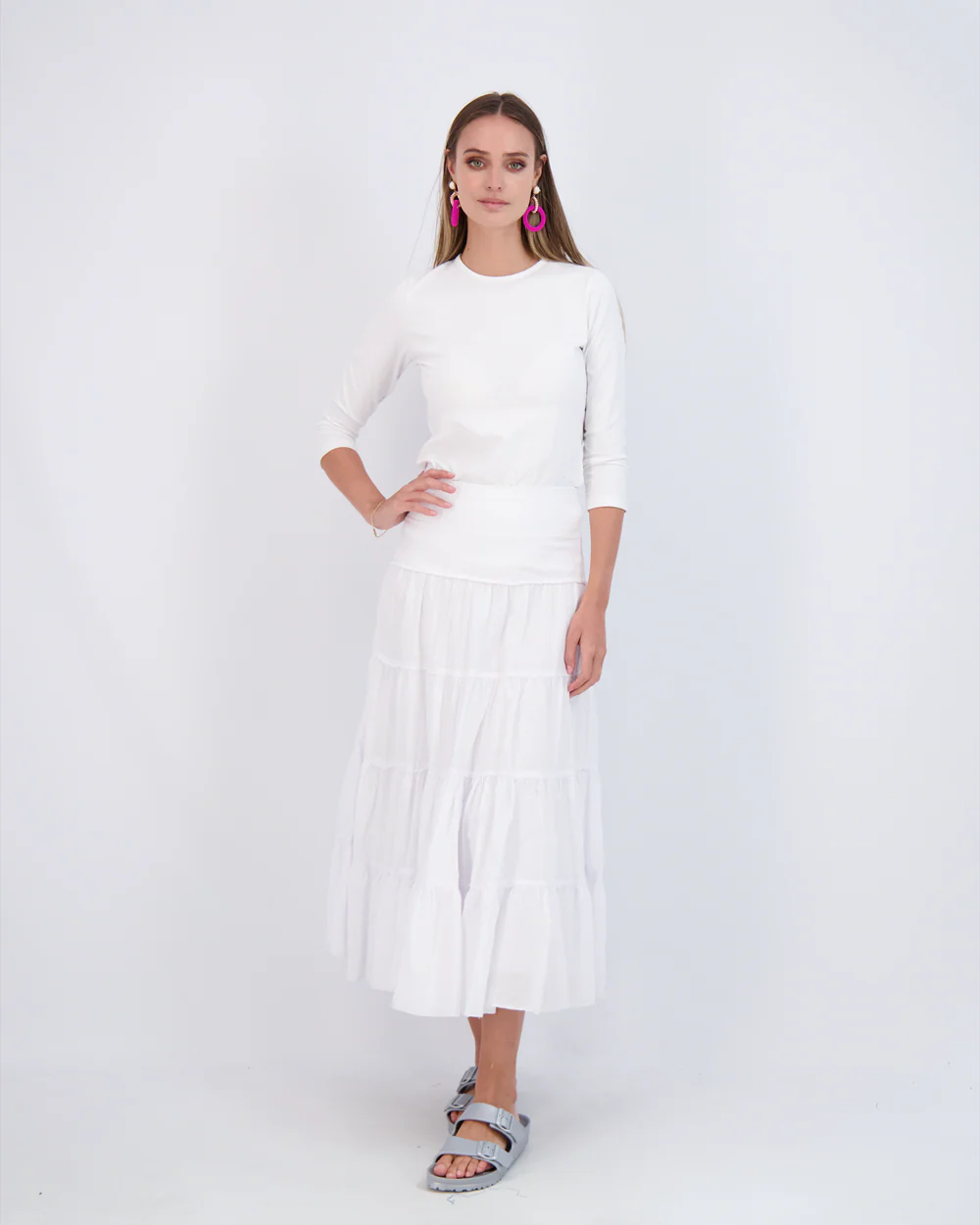 Ladies maxi gauze, tiered skirt with rib elastic waistband and wide sweepֲ