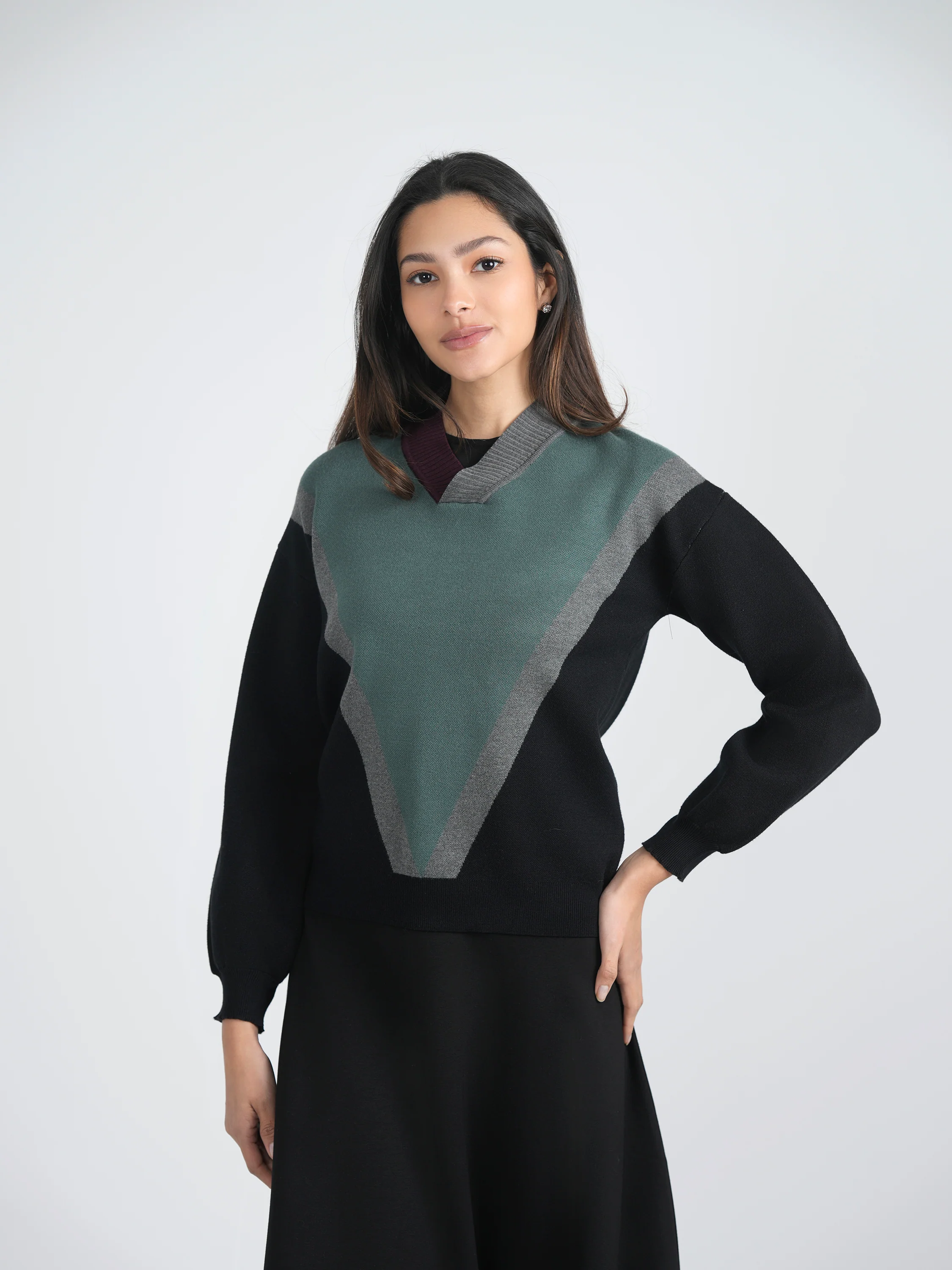 Ladies V Neck color block sweater with jersey knit all over.ֲ