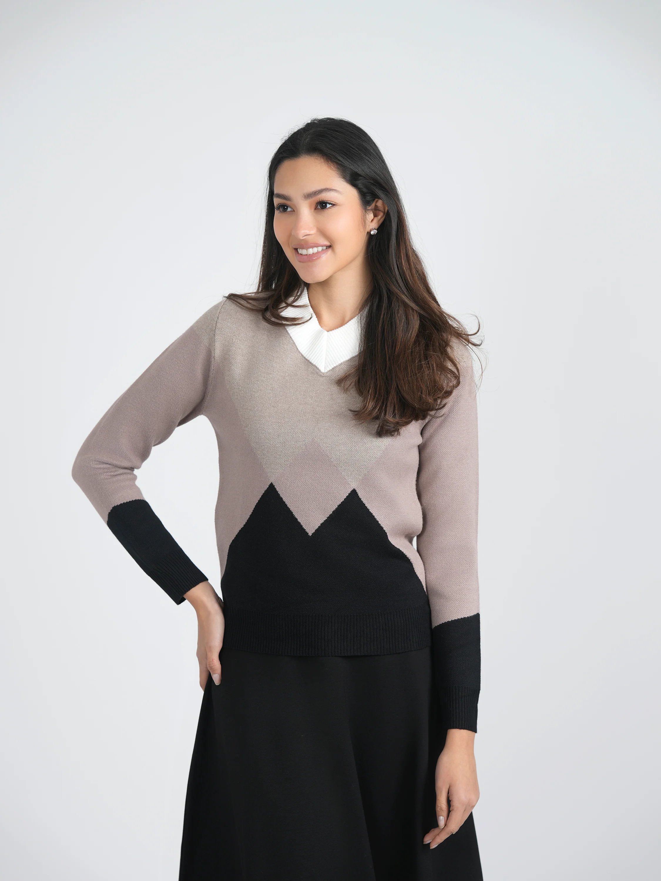 Ladies v-neck intarsia knit sweater with long sleeves. ֲ
